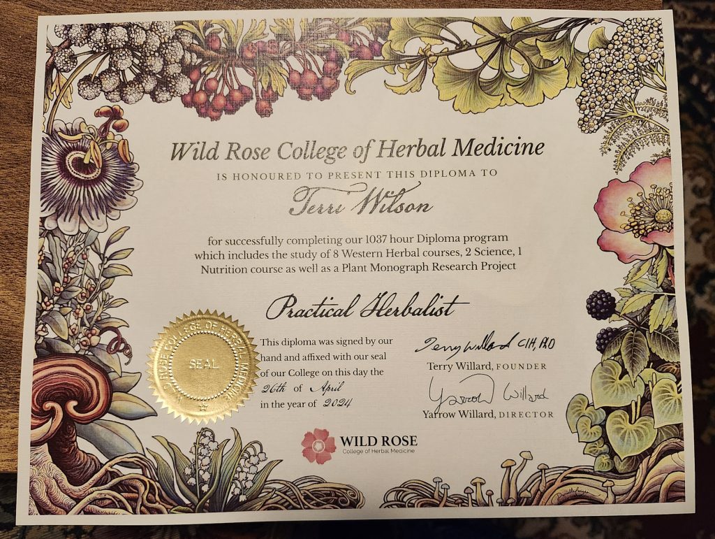 She holds the designation of Practical Herbalist from Wild Rose College of Herbal Medicine (still studying for Master Herbalist), and she also has a B.Sc in Biology. As well, a certified health and nutrition coach.